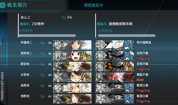 最初の予定だと皆99にするつもりでしたが、そうするとケッコンしない場合経験値が無駄になってしまうので98になったら一時引退、って感じかな……今96の金剛が一番目の引退(仮)艦になりそう